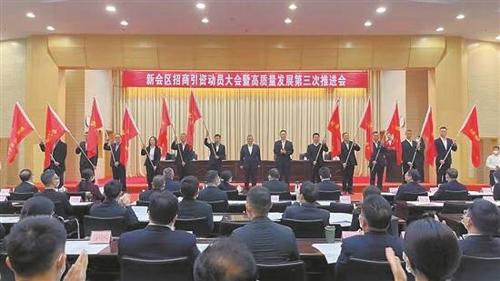 今年新春开年以来,新会区率先连续召开三场高质量发展大会,力求在拼经济的这场大战中先发制人。第一场高质量发展大会,吹响全面率先冲刺千亿GDP强区的号角,凝聚全区上下合力。第二场高质量发展大会,认真倾听银企界心声,提振拼经济的士气。第三场高质量发展大会,立下招商引资“军令状”,全面掀起“大招商、招大商”热潮。