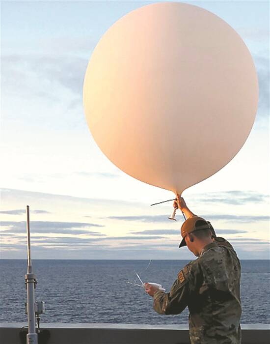 2022年12月11日,一名美国空军成员在美国航空母舰波特兰号上部署气象气球 图/视觉中国