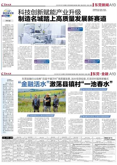 金融是经济的血脉,也是乡村振兴的关键支撑。一直以来,东莞金融行业在助推东莞农业农村现代化方面贡献着重要力量。推进“百县千镇万村”高质量发展,金融行业积极投身其中,有效发挥金融“活水”的作用,展现新担当新作为。