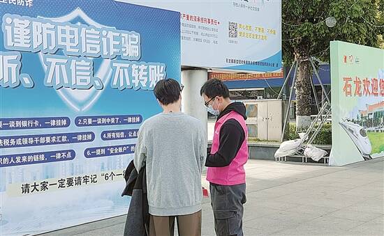 东莞移动工作人员在交通站点向市民普及防诈知识