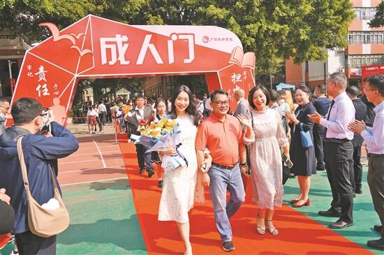 记者采访了解到,除铁一外,上周末,广州市协和学校、广东华侨中学、广州市第一一三中学等学校也为高三学子举行了成人礼。阳光下,同学们盛装出席,在家人的陪伴下步上红毯,迈过“成人门”,接受来自老师、同学、家人的祝福。跨过成人门,代表着与稚嫩告别,走进十八岁的成人世界;代表着未来的浩瀚之旅即将开启,肩头多了一份责任与担当;代表着昨日的奋斗和汗水,终将成就明日闪亮的自己。