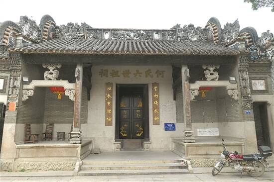 而在烟桥前头,有一座保存相当完好的祠堂,叫何氏六世祖祠。村里原本有六座祠堂,可惜除何氏六世祖祠外,其余5座都消散在历史长河里。六世祖祠重建于清嘉庆十九年(1814年),现在保留的是清末重修后的原貌,精致典雅的砖雕、石雕、灰雕、木雕在经历了百年的历史风霜后,昔日容颜展示在世人面前。