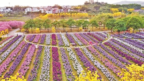 广州南沙的百万葵园是省内著名的花海景区、踏春赏花地,无论是悠然花田间的马术运动,还是在花田里自在穿梭火车,都让花海显得更加烂漫。而位于佛山高明的盈香生态园,盈香花海里的黄花风铃木、一串蓝、天竺葵、海棠花、金鱼草等也迎来了最佳的观赏时期,成为不可错过的绝佳花景打卡地。