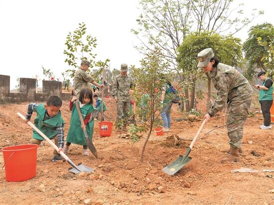 志愿者和驻地部队官兵共同植树