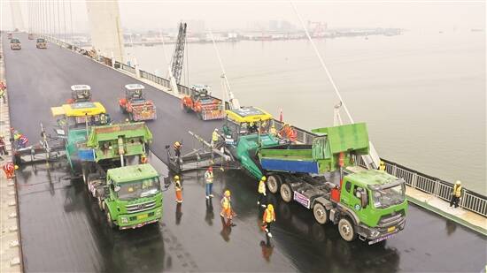 保利长大深中通道S15标项目部经理唐凌炜介绍,随着中山大桥钢桥面铺装完成,累计施工面积已突破15万平方米,约占钢桥面摊铺总量的40%。