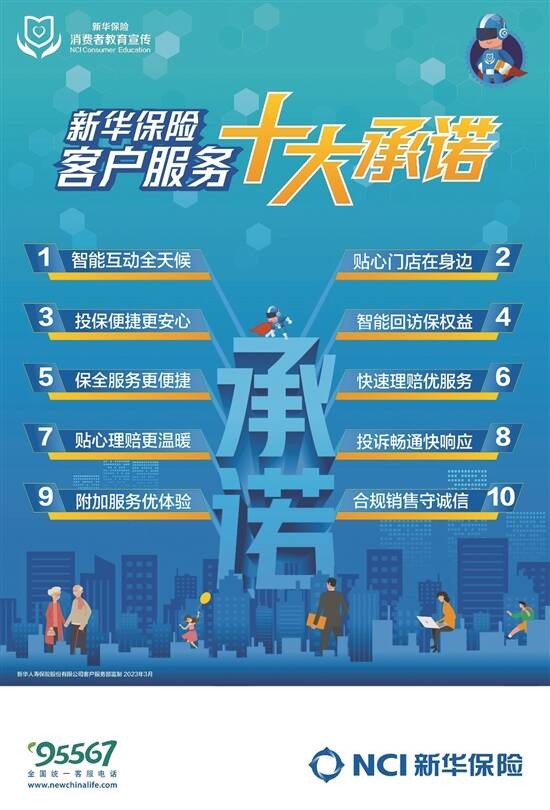 新华保险积极贯彻落实中国银保监会要求,进一步做好消费者权益保护和金融教育宣传工作,在“3·15”期间全新发布2023年客户服务十大承诺,持续提升服务品质,优化消费者体验。
