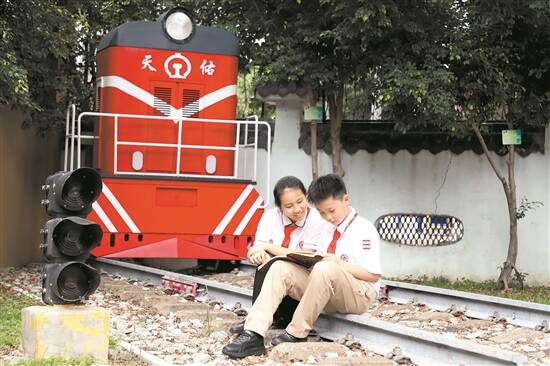 孩子们很喜欢校园里的铁路景观,很多课程都能以此为教具:科学课上,老师会带着孩子们过来观察铁路两旁的植被;劳动课上,老师和孩子们会一起打扫铁路小径的落叶;思政课上,孩子们会带上《家校公约》这本红色教材,在红色火车头小景处大声朗读。
