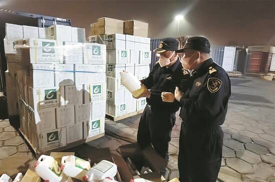 此前,佛山某公司向佛山海关驻南海办事处申报出口一批“不锈钢盆、玻璃瓶”货物,现场关员查验时发现,集装箱内夹藏有大批未向海关申报的塑料罐装溶液。这些罐装溶液表面和外包装纸箱上均印有“Sodium Hypochlorite(次氯酸钠) ”等英文字样,没有张贴危险品警示标识,打开盖子后能闻到明显刺激性气味。经确认,该批罐装溶液为次氯酸钠溶液,共计1440罐、7000升。
