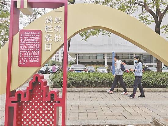 羊城晚报讯 记者陈卓栋,通讯员周颖森、谭耀广报道:记者21日从江门市委宣传部获悉,今年,江门由市委宣传部牵头策划,依托中国侨都华侨华人博物馆(以下简称“侨博馆”)、五邑华侨广场、院士路及周边区域所形成的“侨都文化”城市氛围圈,将江门侨批文化元素进行城市景观化植入,形成一条约200米长的侨批文化长廊。这个城市文化赋能项目将近年来江门开展侨批研究活化成果进行立体景观式呈现,更好彰显了江门侨批作为世界记忆遗产的时代价值。