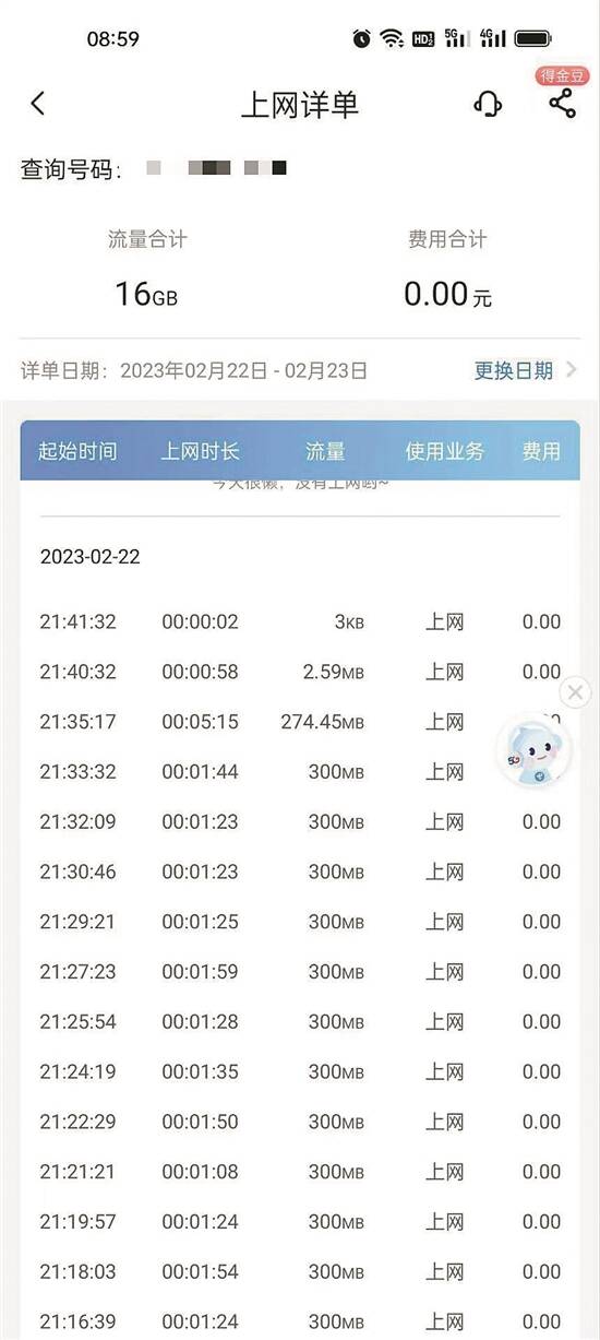 另一位用户陈女士(化名)是七猫的新用户。她在2月22日晚间通过七猫阅读小说,其间并未点开广告视频,在她提供的运营商后台上网详单中,记者看到,从当天19时35分到21时35分的时间段,每隔1-2分钟就会消耗300MB流量,总共扣了52次,使用流量超15GB。