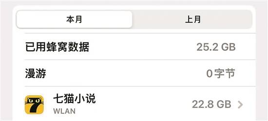 七猫老用户也存在流量消耗异常情况。用户吴先生(化名)告诉羊城晚报记者,他使用七猫已很长时间,之前都很正常,直到今年2月,当他点开手机流量监测后台发现,七猫当月消耗运营商流量达22.8GB(未包含局域网上网流量)。“我只有在空闲的时候才看看小说,一天平均下来最多2小时,一个小说软件能用这么多流量着实离谱。”于是,从3月起,每当打开七猫前,他都会条件反射地先关掉手机蜂窝数据。