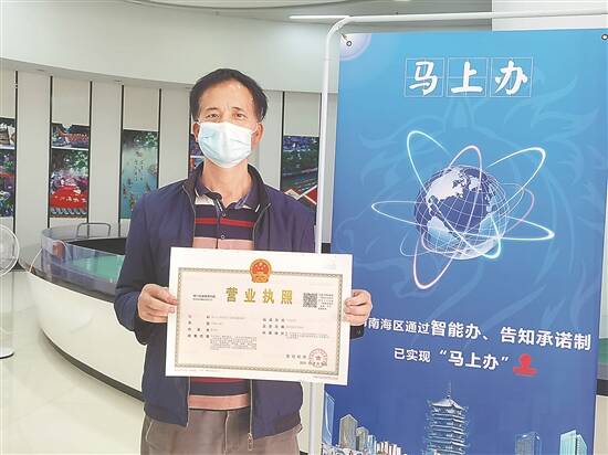 市民在南海区九江行政服务中心网办专区申报并成功领取餐饮类营业执照 南海区市场监管局供图