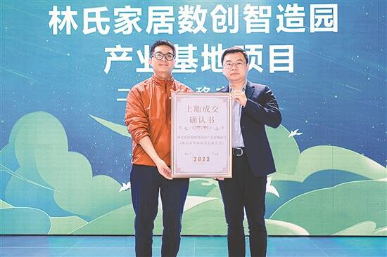 羊城晚报讯 记者张闻、通讯员郑晓玫摄影报道:近日,林氏家居数创智造园产业基地启动大会暨二期用地移交仪式(简称“启动大会”)在南海九江举行。在大会上,南海九江政府向林氏家居移交了“林氏家居数创智造园”二期项目的土地确认书。
