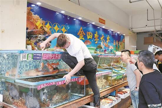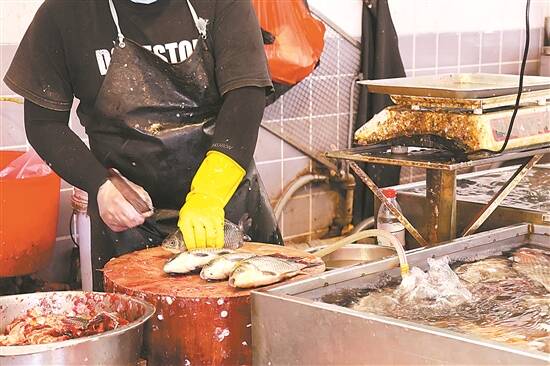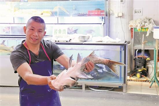 热情的鱼档老板向记者展示最肥美的鲜鱼