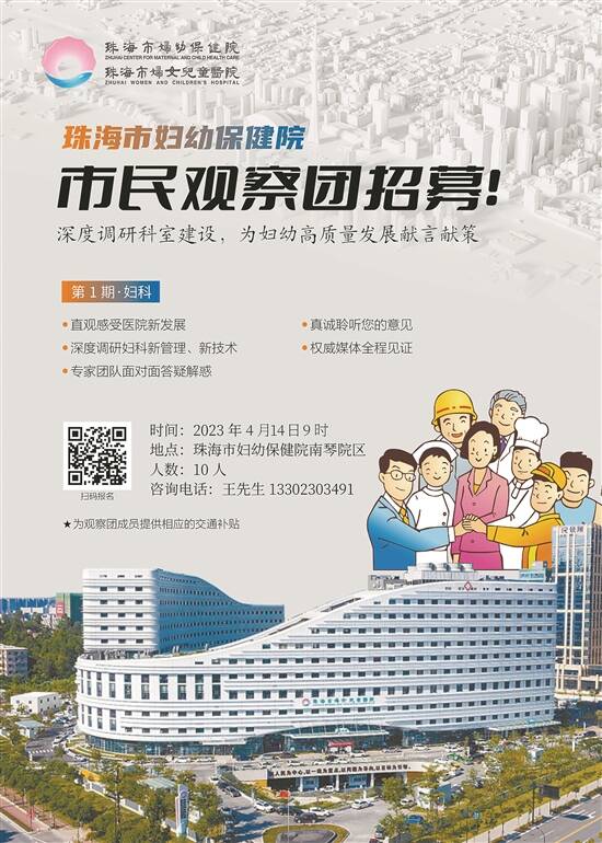 活动时间为4月14日9:00—11:30,活动地点为珠海市妇幼保健院南琴院区。即日起,广大市民朋友可以通过扫描下方二维码进行报名,亦可拨打联系电话13302303491进行活动预约。活动将为观察团成员提供相应的交通补贴。