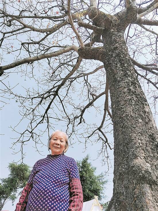 村民邝葵娣与古木棉合影