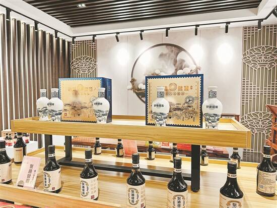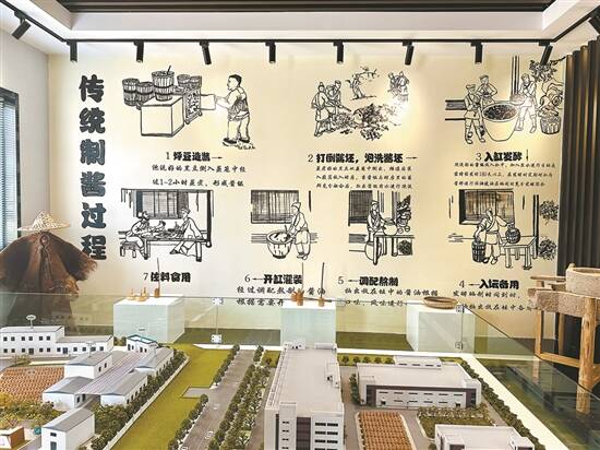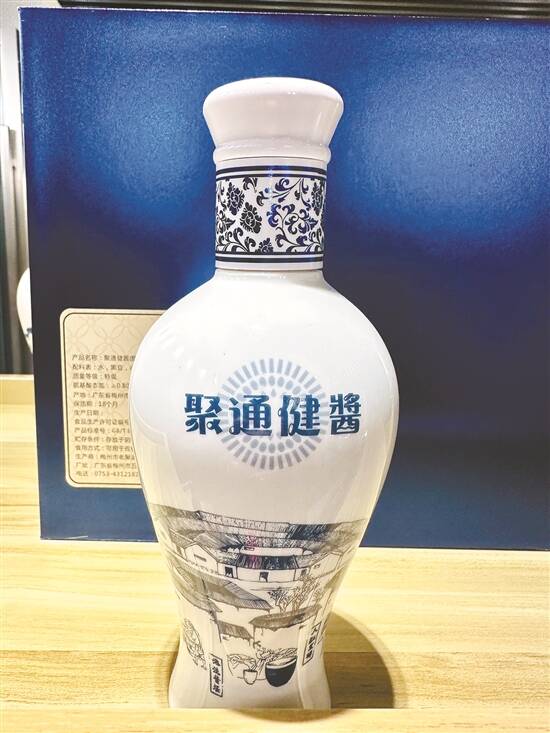 走进老聚通公司产品展示馆内,一款名为“聚通健酱”的酱油引人注目,瓷白色的瓶身上勾勒出一幅幅客家围龙屋的样貌,还将古法酱油步骤以绘画的形式融入其中。此外,老聚通公司与华南理工大学食品工程学院合作创新风味研究。这款酱油通过发酵调控酿造出高品质黑豆酱油,酿造时间长达8个月,里面的有益菌能最大程度将黑豆中的蛋白质和糖类分解为小分子的肽、氨基酸、寡糖和单糖,增加酱油的浓度,蘸酱时酱油能完全附着于菜肉中,保证每一次食品蘸酱时的风味。