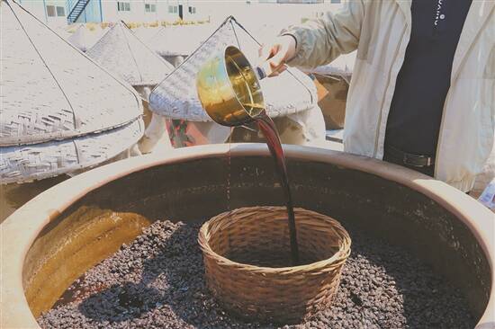 发酵晒制时间足够时,把缸内的酱油抽出放在坛中备用。