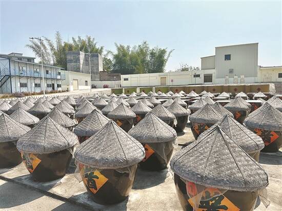 一缸缸酱油摆放在露天广场内,在阳光下得到充分发酵;工人们来回穿梭,掀起酱油缸上遮盖着的巨大“斗笠帽”,手中握着淋油木勺,从酱缸中间的竹篓,舀出汁水淋在酱醅上;广场之中,浓郁的酱油香气扑鼻而来……走进梅州市老聚通食品有限公司(以下简称“老聚通公司”)厂区,只见200多个酱缸整齐排列,颇为壮观,酱缸之中的酱油,将在这里静静地晒足180天以上,直至彻底发酵完成。随着时间流逝,酱香也愈发浓郁。