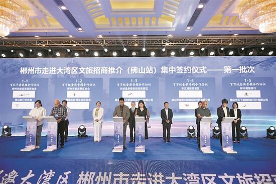 第一轮百社千团签约仪式,签订合作协议5个,包括佛山旅行社协会与郴州市旅游资源联合会百社千团战略合作协议、顺德区自驾车旅游协会与郴州市景区协会百万现金奖营销合作协议、佛山市禅之旅国际旅行社有限公司与汝城温泉福泉旅游度假区百万现金奖营销合作协议、佛山市南海中旅国际旅行社有限公司与郴州东江湖景区百万现金奖营销合作协议、佛山市天下游国际旅行社有限公司与郴州假期旅行百万现金奖营销合作协议。