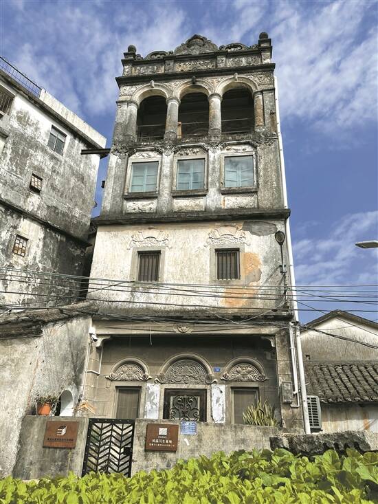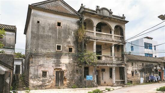 拐进村道的狭巷,便可看到洋气的碉楼“李竹林堂”,该楼高两层,一楼立有四根罗马式圆柱,二楼骑楼过道正侧三面共设有七个拱形孔门。屋顶上大大的“李”字格外显眼,下方是“竹林堂”三字,周边的浮雕设计精致,屋顶左侧落款处“民国 廿二年秋月建”依稀可见。目前,整栋建筑已经破败,但当年的气派、豪华之感仍扑面而来。73岁的村民李渊明告诉记者,“李竹林堂”是当时村里的聚会场所,供外地闯荡返乡的村民交流、活动。