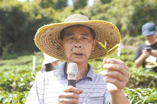 茶场负责人祥叔介绍采茶技巧