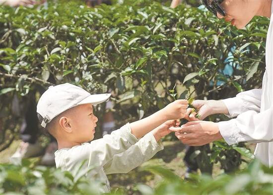 亲子家庭在茶园体验采茶