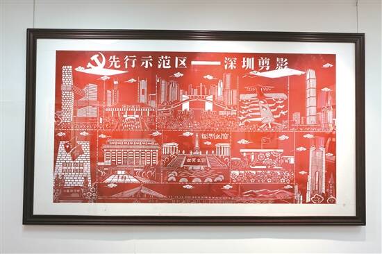 在新桥社区非遗文化展示馆剪纸室,一幅《先行示范区——深圳剪影》引起了记者的注意。“我创作这个作品的时候,是以深圳主要地标性建筑剪影来展示深圳的腾飞。”吴海凤表示,这幅作品,将中英街、深圳北站、罗湖口岸、地王大厦、市民中心、市委、京基100、世界之窗、腾讯大厦、深圳湾大桥、深圳机场11座代表性建筑物以“邮票”方式编排,方寸艺术记录了深圳改革开放的大发展。作品两处呈现深圳市市花簕杜鹃,象征深圳人热情、坚韧不拔、顽强奋进的精神。深圳市委门前“孺子牛”雕塑,也浓缩了特区精神,反映了深圳建设者勇于开拓、大胆创新、无私奉献、奋勇前进的创业精神。目前,该幅作品已被国家博物馆收藏。