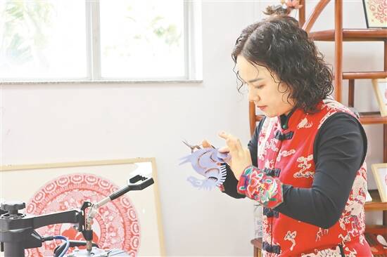 吴海凤正在进行艺术剪纸创作