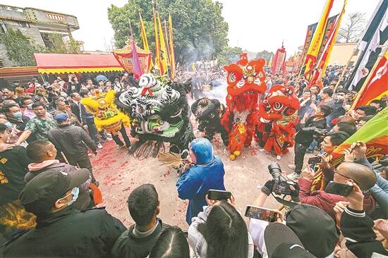 醒狮翻腾、锣鼓喧天、鞭炮齐鸣