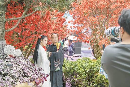身着汉服的年轻男女被一众“长枪短炮”包围拍照