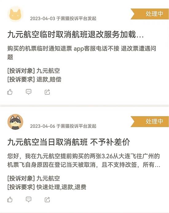记者看到,在黑猫投诉平台上,投诉编号为1736610****的用户也表示,近日收到九元航空公司由于“公司原因”临时取消航班的通知,且同样无法改签当天其他航班,只能临时购买其他航司的机票。该用户称,希望九元航空赔偿机票差价,但周旋一个月仍未果。还有用户表示,在起飞前10小时突然被九元航空告知因公司原因取消航班,导致额外增加200多元的酒店费用。此外,还有一些用户就九元航空仅通过短信通知的形式来告知航班取消信息的行为表示不满,认为没有尽到提醒义务。