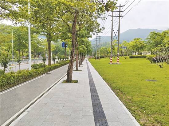 为确保人行道改造效果协调美观,市交通运输局大鹏管理局反复进行现场调研,参考周边公园绿道、社区广场的城市家具和地面铺装,比对住宅小区、工业园区楼体外立面配色,结合周边绿化情况,充分开展选色论证。最终,选择确定了与周边环境设施更加协调的芝麻蓝调灰色面砖作为主体铺装,衬以中国黑色盲道砖的配色方案。通过近似色和对比色的巧妙运用,让整体观感简约大气、精致细腻。