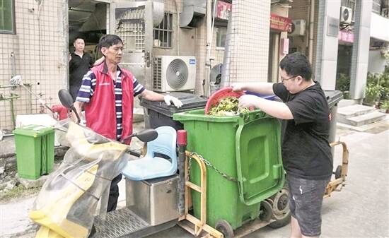 在督导员指导下,银鑫花园周边餐饮单位从业人员主动配合厨余垃圾定时收运工作