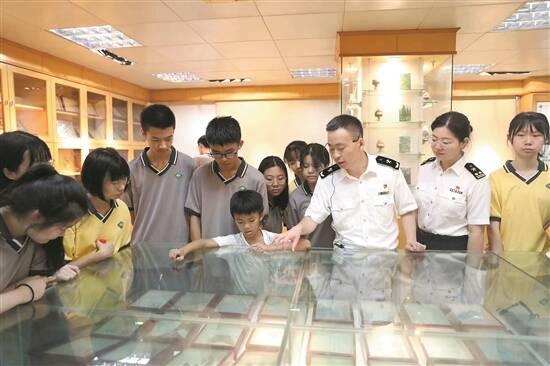 羊城晚报讯 记者张闻,通讯员龚琳、黄晓花摄影报道:在六一儿童节到来前夕,5月20日,佛山海关驻南海办事处学雷锋志愿服务团队开展“益苗计划——国门练习生”海关开放日活动,邀请南海石门中学的在校师生走进海关大楼,亲身体验海关的发展历程、关员如何在国门一线“抓虫子”、如何“火眼金睛”识破走私分子的伪装。近70名师生参加了这次生动有趣的研学活动。
