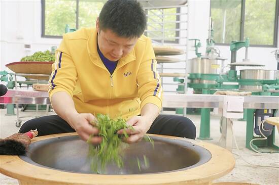 杀青、揉捻、干燥……在梅江区清凉山茶山下,制茶厂的机器轰隆隆地响着,制茶师傅们正将经过晾青萎凋的茶青送进制茶机,一丝不苟地按照步骤进行客家炒绿的制作。
