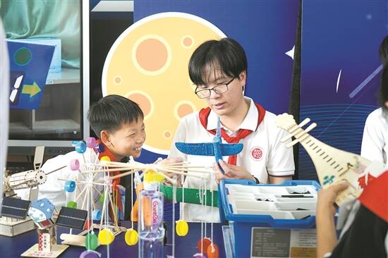 活动现场,“红领巾看佛山高质量发展”主题市集令人眼前一亮。该市集分为“强·制造业”“绿·美佛山”“活·化传承”“美·食振兴”“创·新科技”五大篇章。队员们在各摊位前体验,时而化身“粤菜师傅”,时而以稳扎稳打的马步、灵活敏捷的动作、悦耳动人的歌曲,展示洪拳、醒狮等佛山非遗文化,于游戏中寻找发现家乡佛山高质量发展的“身影”。