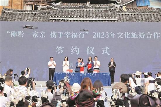 羊城晚报讯 记者杨苑莹、梁正杰,通讯员杨萍摄影报道:6月10日,正值中国第七个“文化和自然遗产日”。当天,贵州省2023年“文化和自然遗产日”暨非遗购物节系列宣传展示活动在黎平县肇兴千户侗寨举办。活动现场,“佛黔一家亲 携手幸福行”2023年文化旅游合作签约仪式正式举行。在一众嘉宾的见证下,佛山市文化广电旅游体育局相关负责人与黔东南州文化广电旅游局相关负责人上台签约。