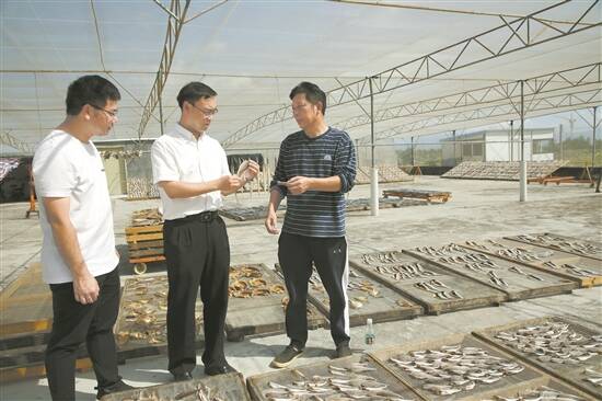 张春晓(中)到晾晒场地调研咸鱼生产销售情况