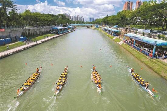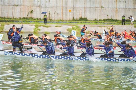 6月19日,由深圳市文化广电旅游体育局、龙华区人民政府主办,深圳市文化遗产保护中心、中共龙华区委宣传部、龙华区文化广电旅游体育局、观湖街道承办的2023深圳市龙舟文化艺术节观澜河龙舟赛在观澜河畔拉开帷幕。一支支龙舟在观澜河上逐浪奋进,两岸人头涌动,观众助力呐喊。伴随着震耳欲聋的锣鼓声和呐喊声,龙舟赛选手们齐心合力、奋楫前行,52支社区组、机关企事业组的龙舟队伍在有“深圳最美河道”之誉的观澜河畔上演精彩赛事。