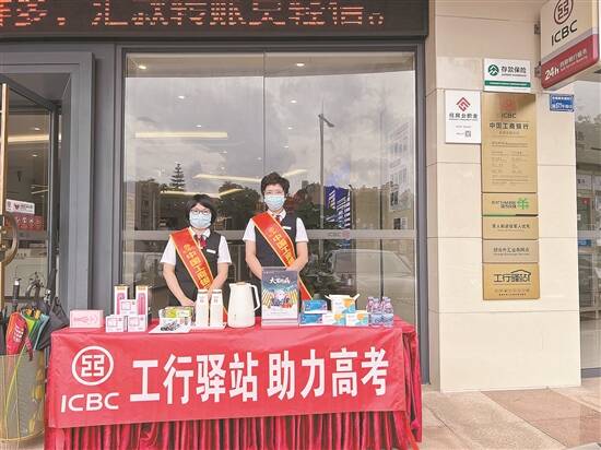 其中,工商银行东莞分行依托“工行驿站”提供系列便民服务。考试期间,该行全辖百余个营业网点均设置了“工行驿站·助力高考(中考)”便民服务站点,为考生及家长免费提供准备矿泉水、文具、纸巾、口罩、打印复印、免费Wi-Fi、雨伞等应急物品,通过送一瓶水、送一句祝福,用小小的举动温暖着家长和考生。