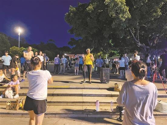 7月9日晚,羊城晚报全媒体记者来到旗峰公园实地走访看到,领舞者名叫Dr.Kymmberli M-S Stowe,今年45岁,来自美国,本职工作是一名心理医生,她还有一个中文名字——真美力博士。