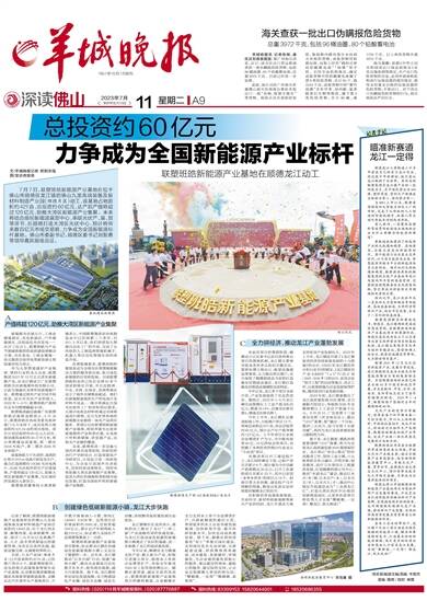 7月7日,联塑班皓新能源产业基地在位于佛山市顺德区龙江镇的佛山九龙高端装备及新材料制造产业园(顺德片区)动工,该基地占地面积约421亩,总投资约60亿元,达产后产值将超过120亿元,助推大湾区新能源产业集聚。未来将结合扬明新能源展贸中心,串联光伏产、展、贸等环节,在顺德打造大湾区光伏中心,预计将带来数百亿元市场交易额,力争成为全国新能源标杆基地。佛山市委副书记、顺德区委书记刘智勇等领导嘉宾现场见证。