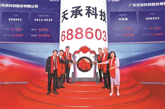 7月10日,广东天承科技股份有限公司登陆上海证券交易所科创板,正式迎来创新发展的新篇章。截至发稿时,N天承股价涨幅58.32%,报87.30元,总市值为50.75亿元。