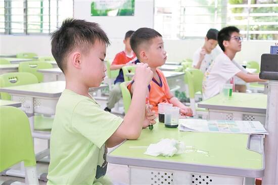 在南城阳光第五小学附近上班的吴女士来自吉林,今年暑期特意回老家接了外孙来东莞过暑假,“外孙是我带大的,很想他,所以一到暑假就接了他过来。但我白天要上班,得知附近的阳光五小开设暑期托管班就赶紧报名了。”吴女士告诉记者,她给外孙选的全托(不含午餐午休),“既有机器人搭建、创意美术等特色课程,又能写作业、阅读等,服务很贴心,也大大方便了我们家长。”
