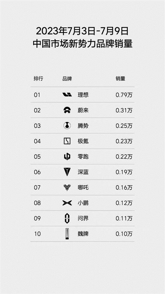 理想汽车周销量数据的真实性引发业界广泛关注。根据理想汽车近期公布的周销量数据榜单,在不久前的2023年第28周(7月3日至7月9日),理想汽车周销0.79万辆,蔚来汽车紧随其后,周销售0.31万辆。腾势汽车周销0.25万辆,位列第三。值得注意的是,造车新势力“蔚小理”中的小鹏汽车月销量仅为0.12万辆,位列第八。
