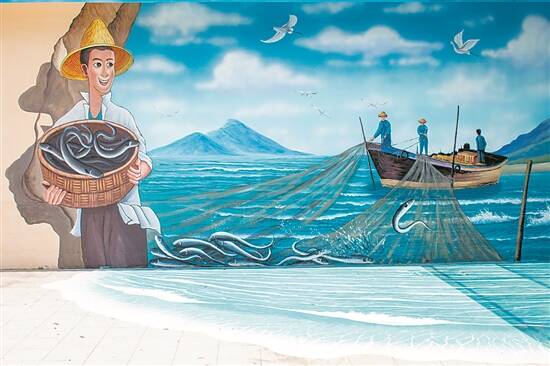 渔民海上捕鱼,晒制美味风鳝,还有斗笠、蓑衣、鳝鱼竹笼、鱼篓等渔具,一幕幕当地渔民生活场景在广场的旧楼房墙上展示,生动地重现黄金村“装风鳝”这一独特非遗文化。值得一提的是,在转弯处,设置有“斗门装风鳝”的简介,游客可一边观赏墙绘,一边了解黄金村的渔文化。