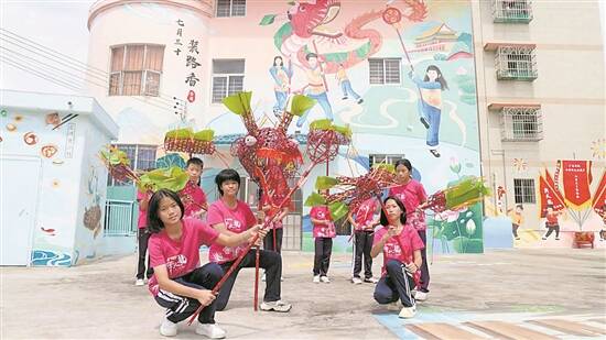 编织、上色、舞龙……采用国潮插画的手法,以火龙的龙身为主线,还原火龙制作过程,充分展现非遗文化的魅力。锣鼓声响起,非遗传承人挥舞着身披芭蕉叶、插满香火的红色火龙,翻腾起舞,款款而来;富有水乡特色的水上婚嫁,同样高调“上墙”。远山层峦叠嶂,岭南青砖瓦房,青翠的荷叶、粉嫩的夏荷……装饰华丽的花船上,新娘一袭红装伫立船头,船过之处,蔚蓝的湖水泛起阵阵涟漪。国家级非遗水上婚嫁、省级非遗七月三十装路香舞火龙……一个个的非遗项目,生动绘制在该中心的外墙上,色彩绚丽,明亮灵动,让当地特有的非遗文化更深入人心。