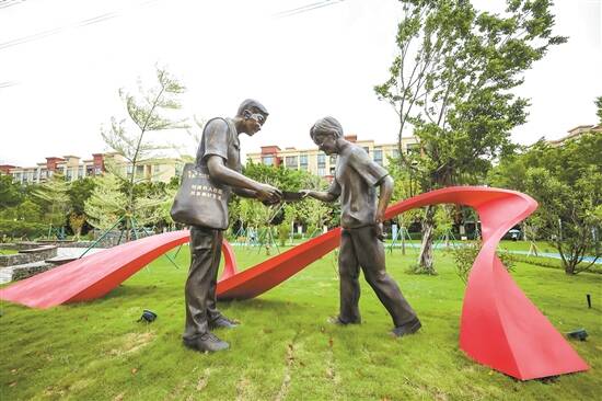 公园中的“奋楫”雕塑十分醒目,该雕塑长12米、高6米,整体以激浪中“双手紧握的船桨”为主体,体现了创熟在社会治理现代化征程中激流奋进、奋勇争先、勇立潮头的使命担当。桂城街道翠颐社区非户籍委员、创熟专干陈昭衡介绍,“船桨”代表了桂城“宁可煲烂 不可扒慢”的龙舟精神,船桨上刻有的“创熟”关键词则凸显了新时代下社区、街坊会、楼长、社会组织等多元主体共同参与社区治理的成就。