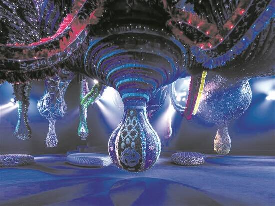 此次大秀最“出圈”的当属秀场的置景。每季与不同的女性艺术家合作打造秀场氛围,已成为迪奥发布秀的惯例,这次葡萄牙艺术家琼娜·瓦斯康丝勒为秀场创作了大型装置艺术作品《瓦尔基丽迪奥小姐》,以近乎壮观的造型占据了整个空间,该作品由织物、蕾丝、刺绣、针织和钩针编织制成,打造出一个神话般的舞台装置,模特在中间穿行,自由又有趣。大秀之后对外开放的沉浸式体验,也吸引了众多观众前往打卡。